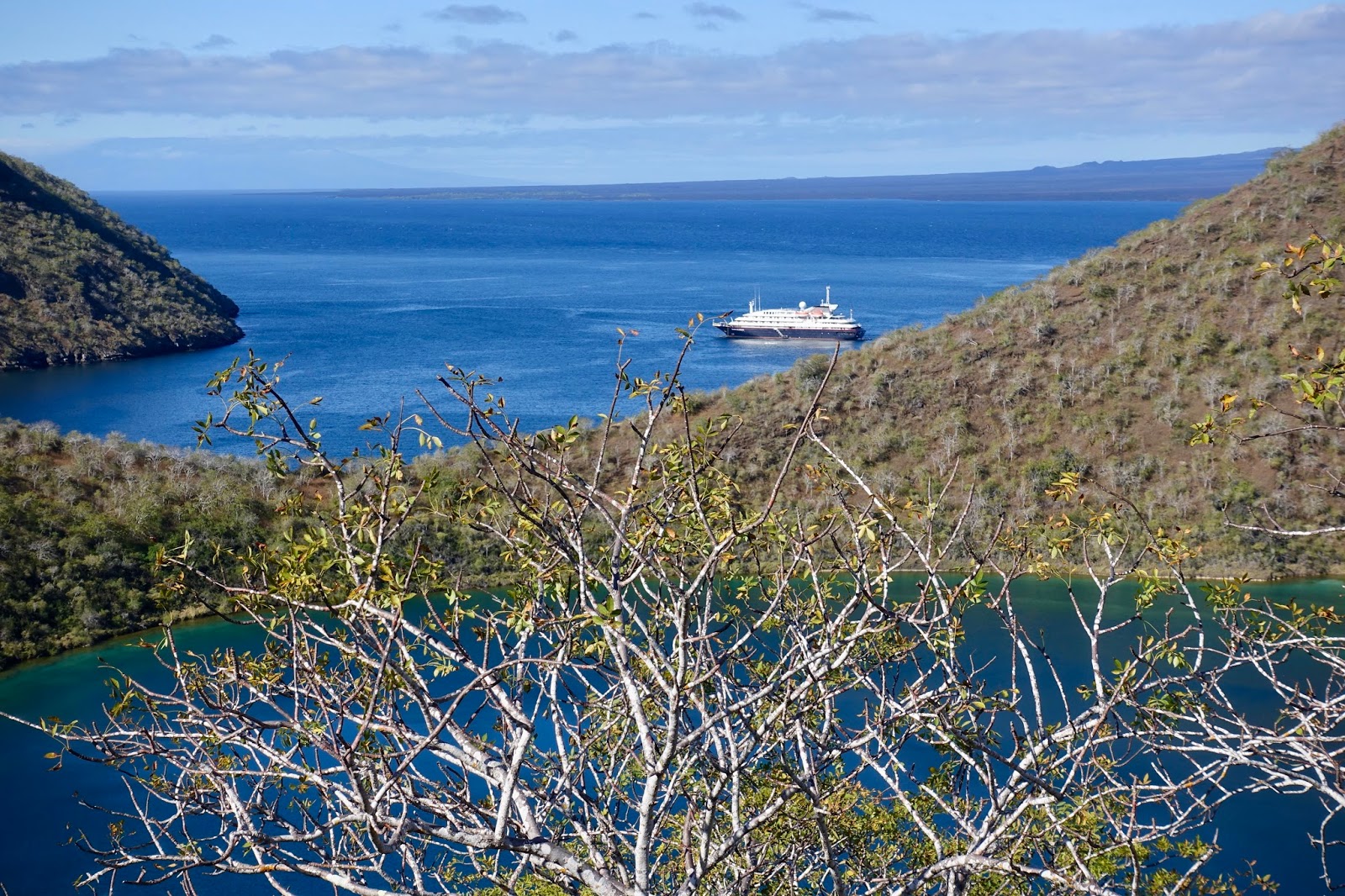 In the morning, the program included a hike to Caleta Tagus, a beautiful cove, sheltered by two volcanic craters. A dusty trail led to a viewpoint for Darwin Volcano. As we climbed we got a good look at the saltwater lagoon in one of the craters and at our ship in the cove. Sights included Galapagos finches and mockingbirds.